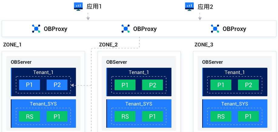 OceanBase数据库整体架构如图所示,一个集群由若干节点组成,这些节点组成不同的可用区Zone。可用区是逻辑概念,具有IDC和Region属性。OB数据库中表数据按照不同的规则划分为不同分片,每个分片称为分区Partition,分区又运行在不同的节点OBServer上。