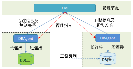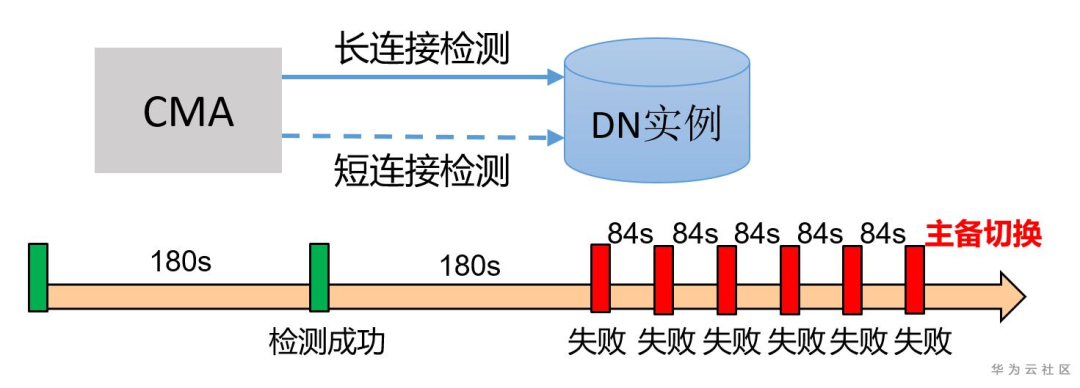 CM Agent和实例之间建立长连接,当长连接断开直到超出心跳时间,cms发送failover命令到备节点,触发主备切换;