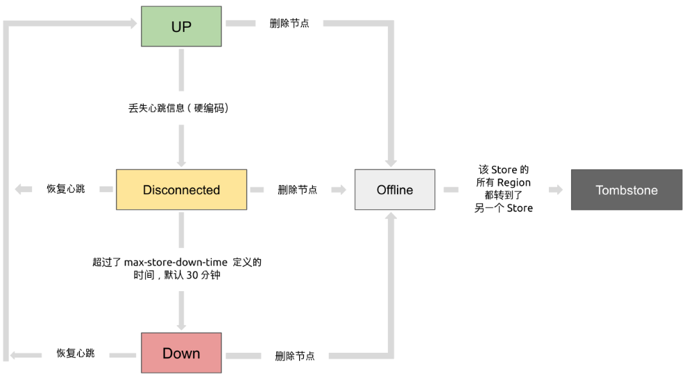 Disconnect:当PD和TiKV Store的心跳信息丢失超过20秒后,该Store的状态会变为Disconnect状态,当时间超过max-store-down-time指定的时间后,该Store会变为Down状态。
