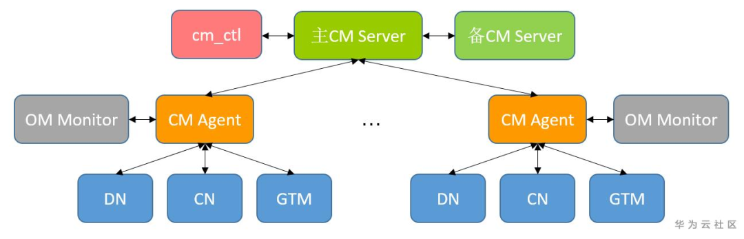 GaussDB(for openGauss)通过集群管理组件CM server和CM agent来进行集群的管理。CM组件提供了四种服务CM Agent、CM Server、OM Monitor、cm_ctl,与各类实例服务组件(CN, DN, GTM 等)一起构成了整个数据库集群系统。
