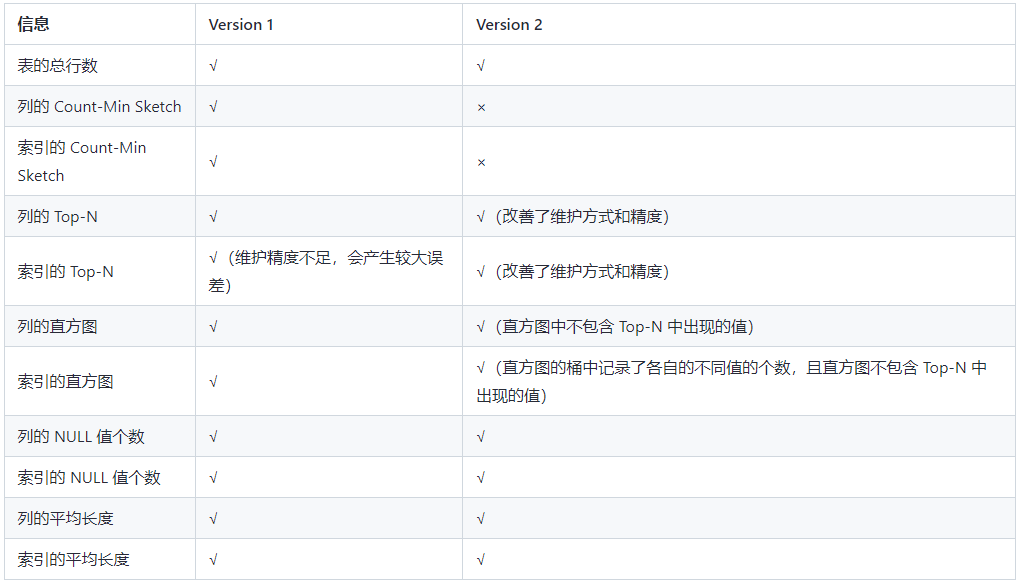 TiDB数据库中使用变量tidb_analyze_version 控制统计信息的收集,在 v5.3.0 及之后的版本中,该变量的默认值为 2。Version 2的统计信息避免了Version 1中因为哈希冲突导致的在较大的数据量中可能产生的较大误差,并保持了大多数场景中的估算精度。
