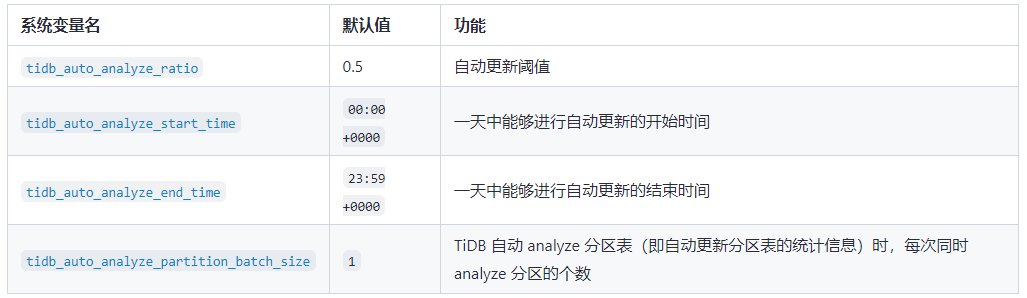另外如果表中修改的行数与总行数的比值大于tidb_auto_analyze_ratio(默认值为0.5),并且当前时间在tidb_auto_analyze_start_time和tidb_auto_analyze_end_time之间时,TiDB会在后台执行ANALYZE TABLE tbl语句自动更新这个表的统计信息。