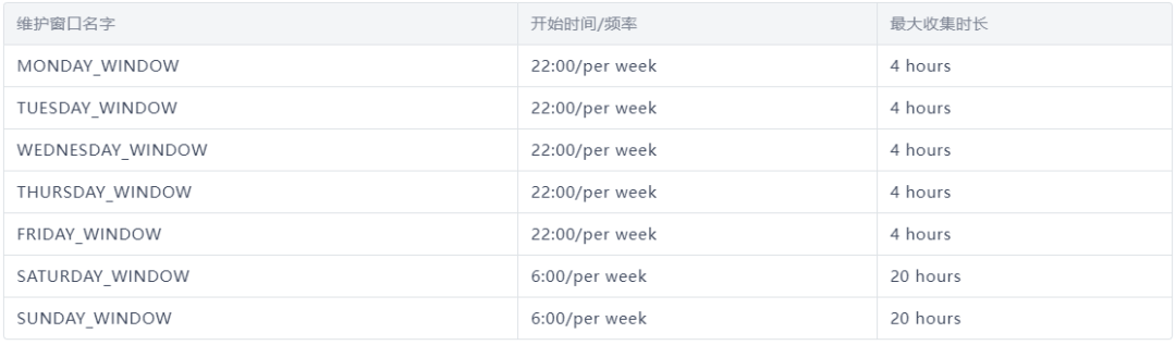Oracle数据库中默认开启统计信息自动收集任务,使用的任务为gather_stats_prog。gather_stats_prog调用了DBMS_STATS.GATHER_DATABASE_STATS_JOB_PROC存储过程。在Oracle数据库中通过设置不同的维护窗口形式,设定窗口运行的开始时间、持续时间: