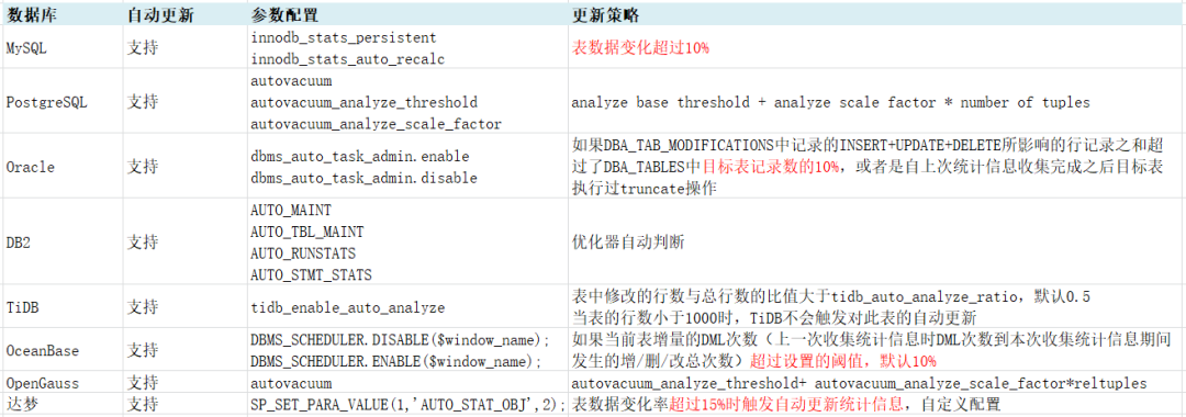 数据库中统计信息描述的数据库中表和索引的大小数以及数据分布状况,统计信息的准确性对优化器选择执行计划时具有重要的参考意义。本文简要整理了下传统数据库和国产数据库中统计信息的自动更新机制,以加深了解。