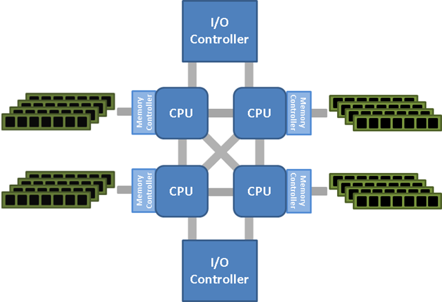 NUMA架构由多个CPU模块组成,每个CPU模块又由多个CPU组成,并且有独立的本地内存、IO controller等。各个CPU节点之间通过互联模块进行访问,在AMD处理器称为Hyper-Transport,Intel在Nehalem-EX系统处理器上引入Quick-Path Interconnect(QPI)。