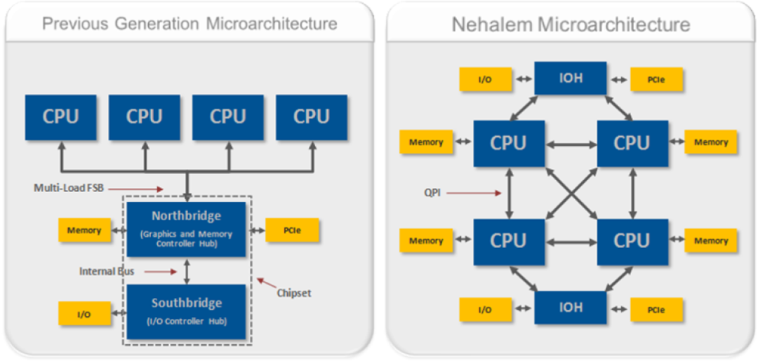 上述架构也称为UMA架构(Uniform Memory Access),在 UMA 架构下,CPU 和内存之间的通信全部都要通过前端总线。但是随着CPU性能的提升由CPU主频向多核CPU发展,越来越多的CPU对前端总线FSB的争用,前端总线逐渐称为瓶颈。NUMA(Non-Uniform Memory Access)架构在此背景下发展起来。