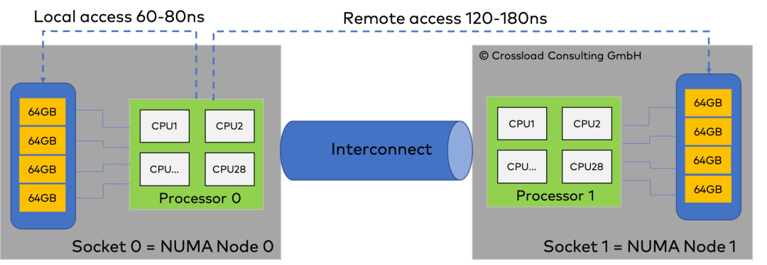 内存交叉访问较多:当进程频繁地访问不同NUMA节点上的内存时,会导致较高的内存访问延迟。通过将进程与某个NUMA节点上的CPU绑定,可以减少跨节点的内存访问,从而降低延迟。