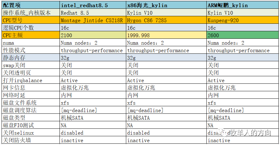 测试服务器都是采用虚拟化主机的形式(虚拟机在同一numa中),没有使用物理机,CPU和内存为16c32G。其中操作系统Intel使用Redhat 8.5、海光和鲲鹏使用的是信创Kylin V10版本,数据库使用的是国产数据库GoldenDB单分片;CPU型号海光是C86 7285、鲲鹏为Kunpeng-920、Intel是C5281R,CPU主频鲲鹏服务器稍高为2600。其它配置具体见表格。