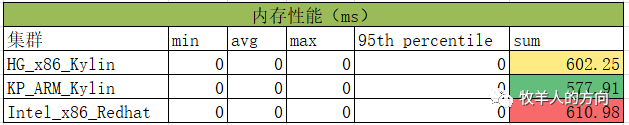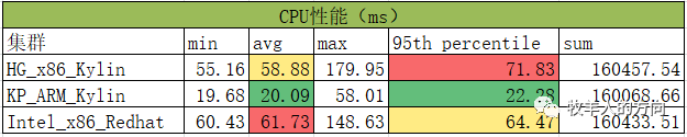 从CPU性能对比来看,Intel和海光的avg时间为鲲鹏ARM架构的3倍;95%占比Intel为鲲鹏的2.9倍、海光为鲲鹏的3.2倍。总体CPU性能上鲲鹏表现更优,和ARM架构的精简指令集RISC有关系。