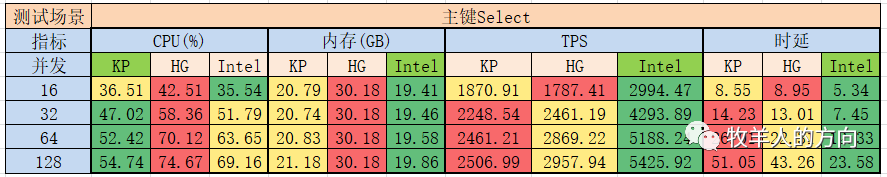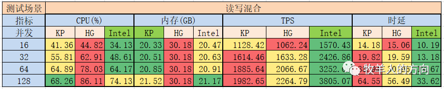 时延:和TPS一样,Intel表现最好、海光次之、鲲鹏稍差