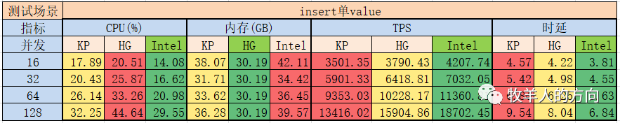 从TPS和时延指标来看,Intel服务器表现更优、海光次之、鲲鹏较差,在单insert插入场景下海光和鲲鹏服务器在TPS表现上总体较Intel服务器性能上差15%~25%。