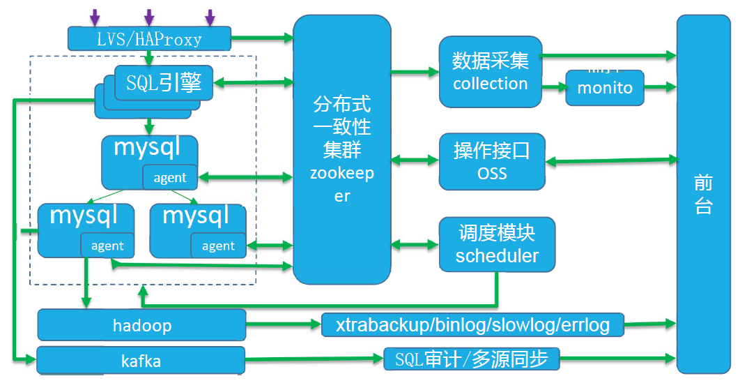 Agent:负责监控DB的存活状态,将健康状态上报Zookeeper,再被Scheduler感知触发切换流程。