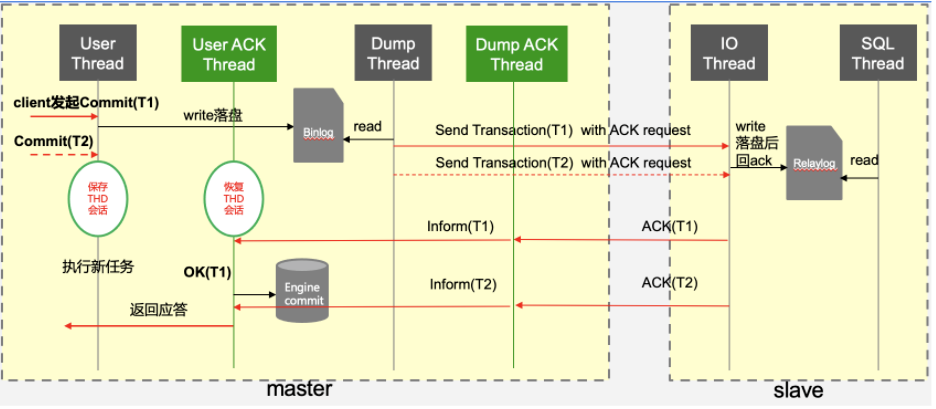 如上图所示客户端写请求提交后,线程池分配连接处理请求,但是并没有立即返回给客户端,而是将这部分信息保存在内存会话信息中。Master发起主备同步请求,接收备机收到binlog的ACK请求,当接收到备机日志落盘的ACK返回后,主节点的工作线程唤起刚刚保存的会话,执行后半段的提交操作,并将结果返回给客户端。因此在Master节点开启了两组线程:接收备机ACK应答线程(Dump ACK Thread)和唤醒hang住的客户端连接线程(User ACK Thread)。