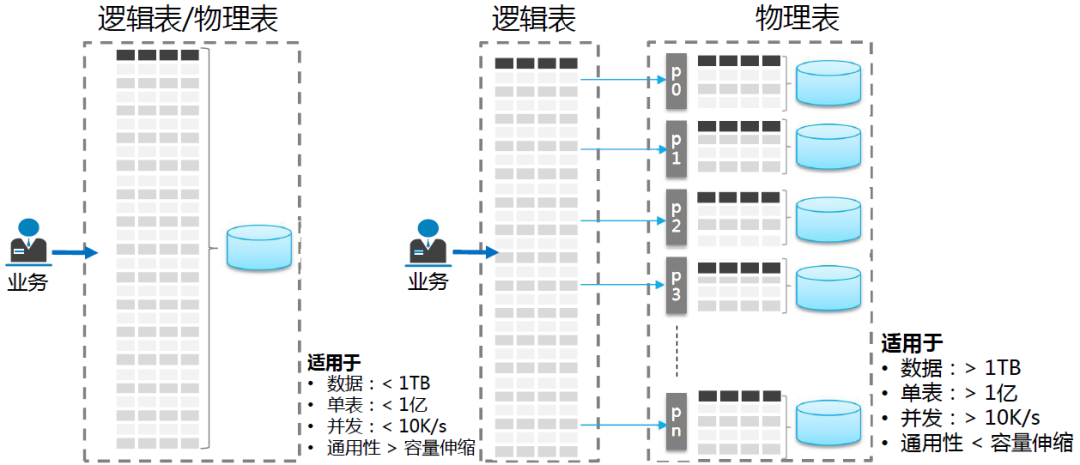 实际上在TDSQL数据库中物理分片和实际的数据库实例SET相对应,一个物理分片包括1主N备的SET组。但是物理分片和逻辑分表并不是一一对应的,一个物理分片上可以存储1个到多个逻辑分表,一个逻辑分表在后台对应了一个水平拆分后最小粒度的一张物理表,多个物理表组成一张逻辑大表。