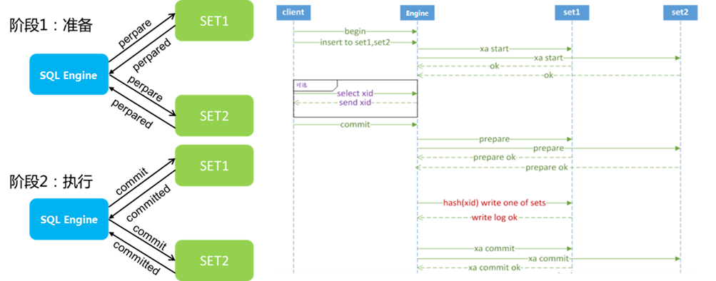 Prepare超时或者失败:向两个数据库分片分别进行写事务操作,当其中一个实例prepare超时或者错误的时候,会触发两个实例的XA rollback操作,并返回给客户端事务报错。