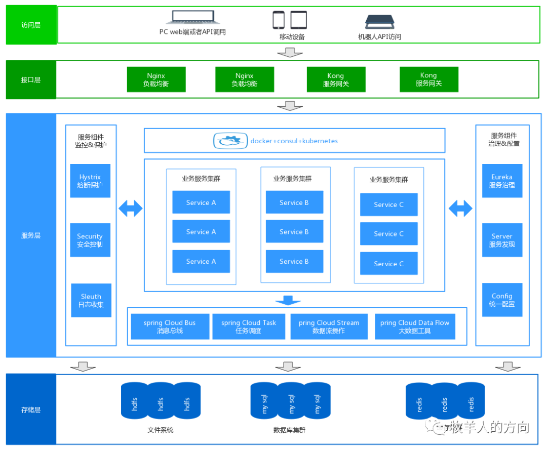 随着分布式和微服务技术的发展演进,越来越多的系统从单体应用向分布式微服务架构转型。在微服务架构下应用服务被拆分为不同的服务模块,这些服务模块之间的调用关系也变得错综复杂,客户端的连接请求可能需要在多个不同的服务单元之间进行流转。此时如果某个服务单元或者模块出现异常,很难快速直观的去定位到异常点,以及对整个系统的影响范围和影响程度、爆炸半径等。如下图所示为典型的微服务架构: