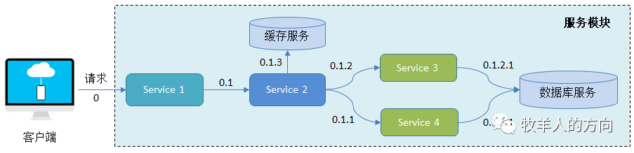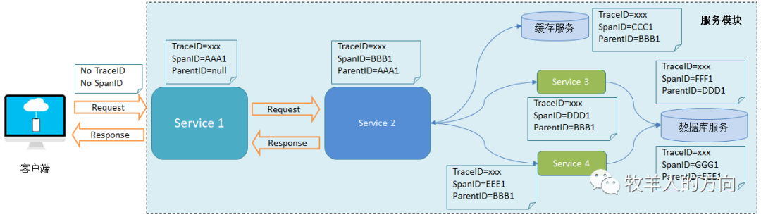 节点数据库服务:SpanID=FFF1,ParentID=DDD1,接收到Service3的请求并返回结果;SpanID=GGG1,ParentID=EEE1,接收到Service4的请求并返回结果