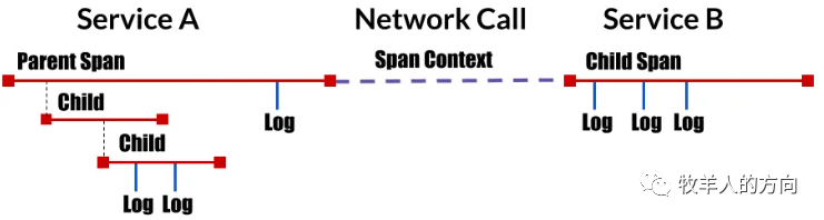 每个Span可以进行多次Logs操作,每一次Logs操作,都需要带一个时间戳,以及一个可选的附加信息。