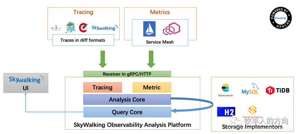 SkyWalking的客户端通过HTTP或gRPC方式向SkyWalking收集器发送链路调用数据。SkyWalking收集器对接收到的链路信息进行分析和聚合,并存储到服务端数据库,支持的存储组件有ES、H2、MySQL、TiDB和Sharding Sphere等。SkyWalking UI则提供了链路调用信息的可视化和检索。以下为Skywalking架构图: