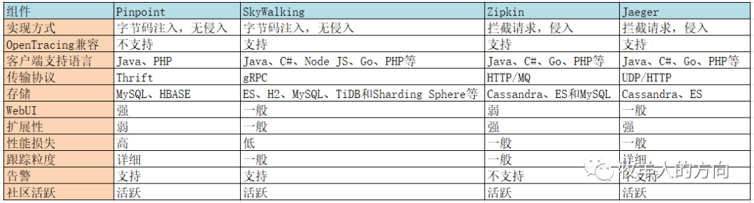 对比上述四种组件,Zipkin本身实现相对简单,指标的分析和展示需求需要二次开发工作;Jaeger是对Zipkin的优化,在WebUI和传输协议上进行了改进,但也无告警功能;Pinpoint不支持OpenTracing规范,并且不支持查询单个调用链,二次开发难度较高;SkyWalking功能较为齐全,探针性能损耗低,同时也支持多种语言的客户端,并且中文社区非常活跃。