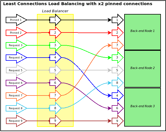 像前面的轮询算法按照前端的请求次数均衡分配,实现后端服务器的负载均衡,但是实际上连接请求并不能真实反应服务器的负载情况。因此引入了最小连接算法,根据后端服务器当前的连接情况,动态的选取其中当前积压连接数最少的一台服务器来处理当前请求,尽可能的提高后台服务器利用率。最小连接算法在本质上是从后端服务器的角度来观察系统的负载,能够最大限度的利用后端服务器的资源,不足之处是负载均衡需要更多的资源来判断后端服务的连接情况。如下图所示最小连接算法的实现: