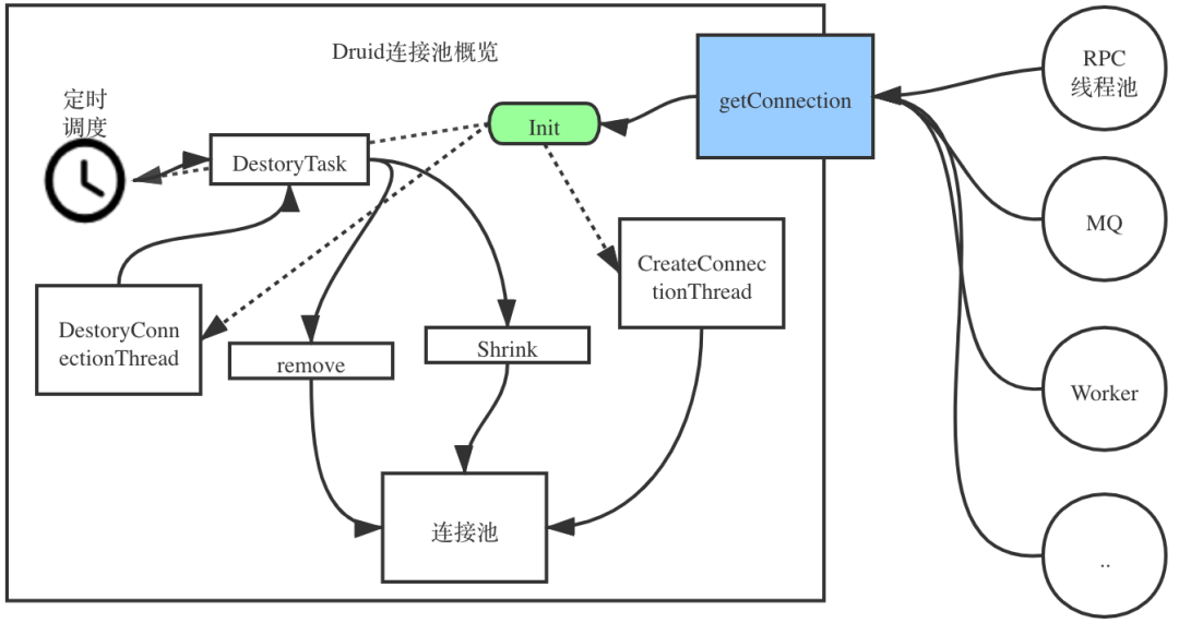 在Druid数据源初始化的时候,会创建一个定时运行的DestroyTask,该任务的主要目的是将已空闲时间满足关闭条件的连接关闭。
