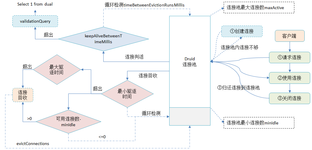 为了防止一个数据库连接太久没有使用,而被其它下层的服务关闭,druid中定义了KeepAlive选项,机制上与TCP中的类似。保活机制能够保证连接池中的连接是真实有效的连接,假如遇到特殊情况导致连接不可用时,keepAlive机制将无效连接进行驱逐。保活机制是由守护线程DestroyConnectionThread发起的,启动后守护线程会进入无线循环,根据心跳间隔时间timeBetweenEvictionRunsMillis循环调用DestoryTask线程,默认时间为60s。