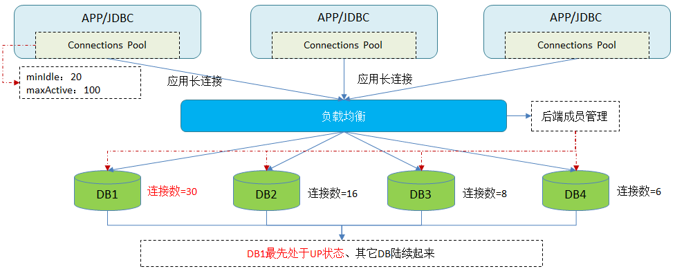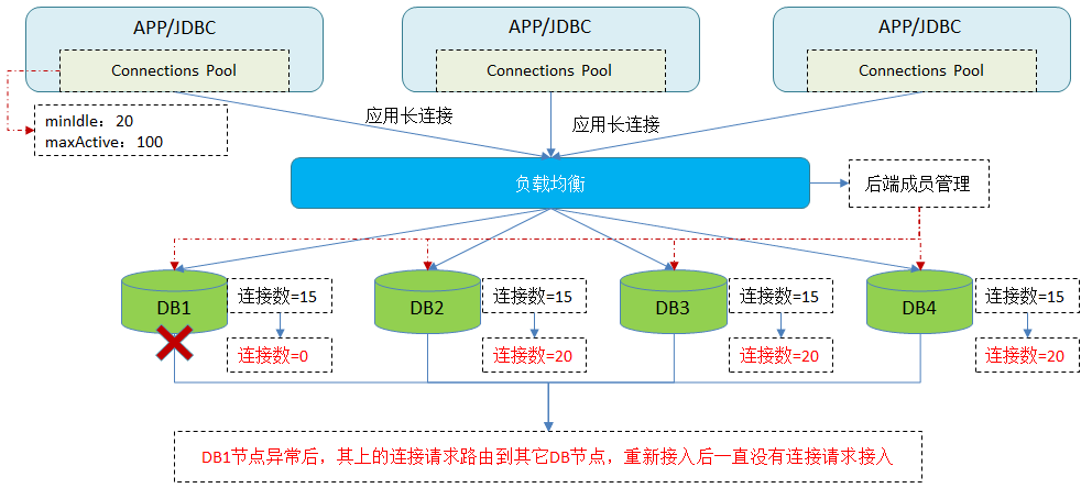 另一个场景是负载均衡后端成员故障后再重新接入的问题,如上图所示,3个应用初始化连接为60,在负载均衡4个后端DB实例中平均为15。当后端成员DB1故障后,其中的连接请求会均发到其它3个成员上,每个DB实例连接平均为20。但是当DB1实例重新接入负载均衡设备后,长时间没有连接请求接入,因为如果有新的连接请求过来,根据负载均衡算法新接入的后端成员肯定会有负载流量的。为什么会出现这样的问题,也是下面将介绍的连接池最小连接过大的问题。