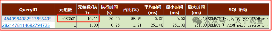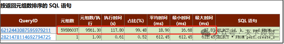 然后对比发现,跑的慢的,每次执行(查询)返回元组数(行)9561。