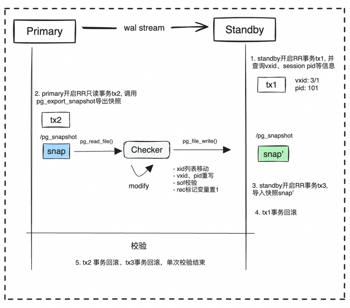 - 部署一个能同时连接主库和备库的Checker脚本,通过pg_read_file() API读取快照信息,将快照信息进行校验和重构后使用pg_file_write() API将快照写入standby节点