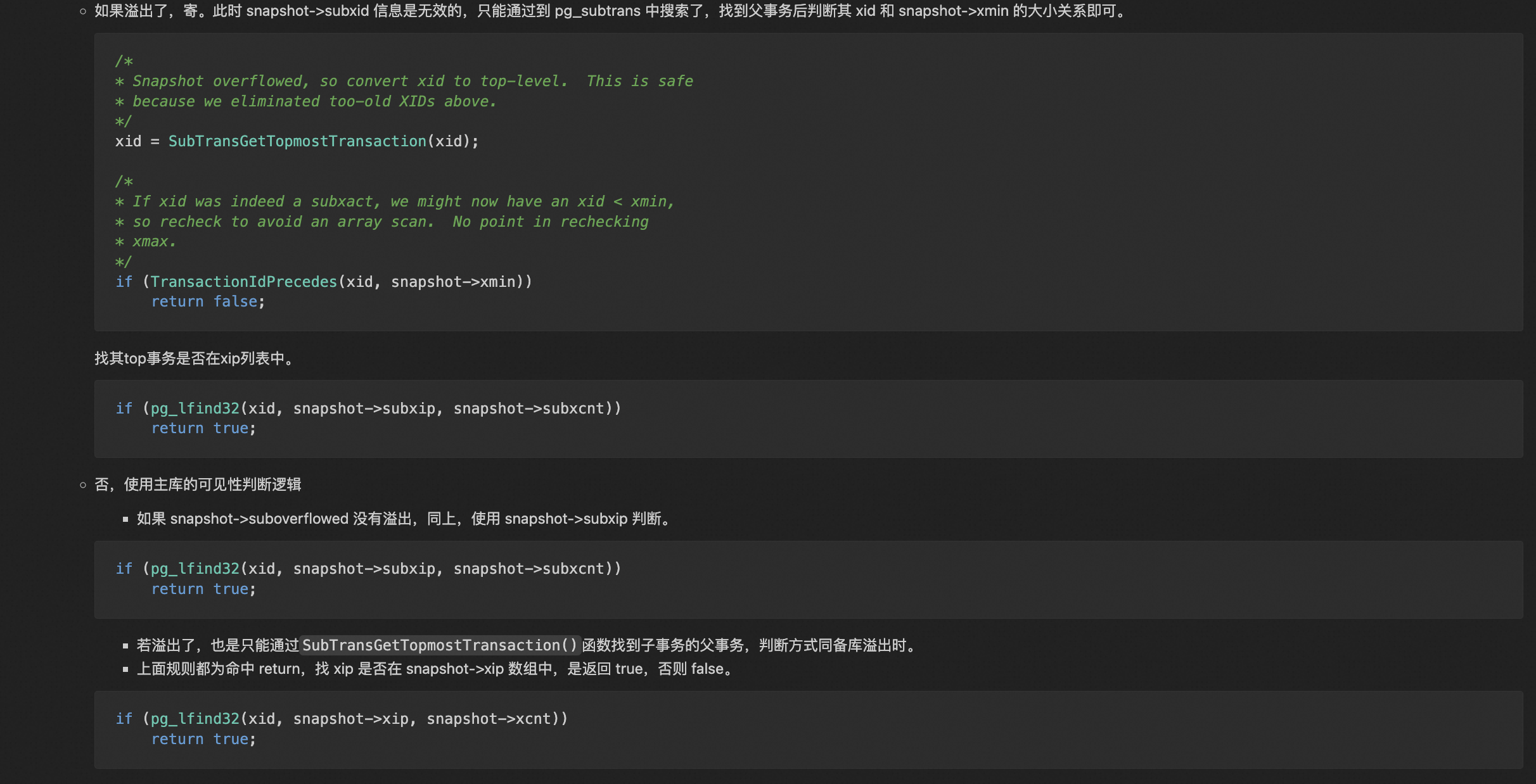 - 当主库子某个session子事务溢出时(到达64),会向备库发送一条wal日志,备库会将64个子事务保存在pg_subtrans中,余量sub xid依然维护在KnownAssignedXids中。所以,当主库子事务产生溢出时,其打出的快照是不可以在备库中使用的,会导致备库快照子事务信息不完整而使的主库和备库对某张表的逻辑数据查询结果不一致。所以,当主库的快照存在子事务溢出情况时,该快照不能同步到备库,否则可能导致查询结果错乱。