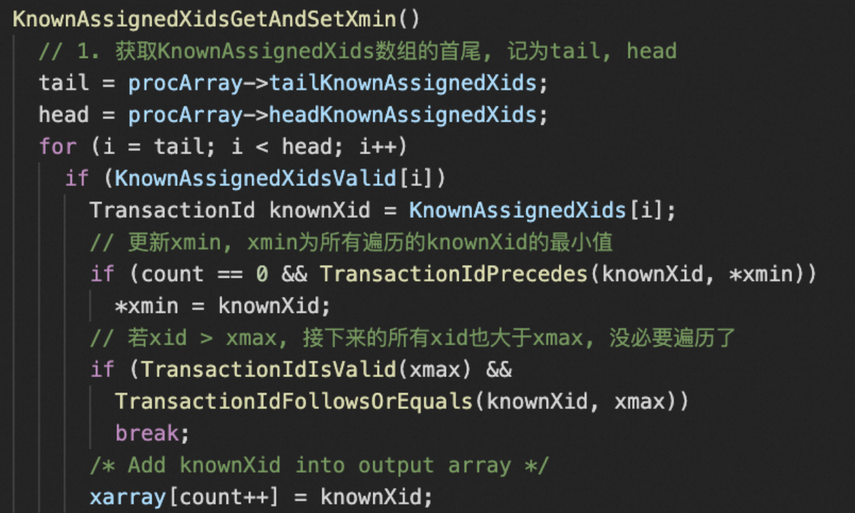 - 主备之间的事务id通过wal日志的流复制机制进行同步:备库在共享内存中维护了一个名为KnownAssianedXids的数组,用来同步记录收到的事务或子事务id。