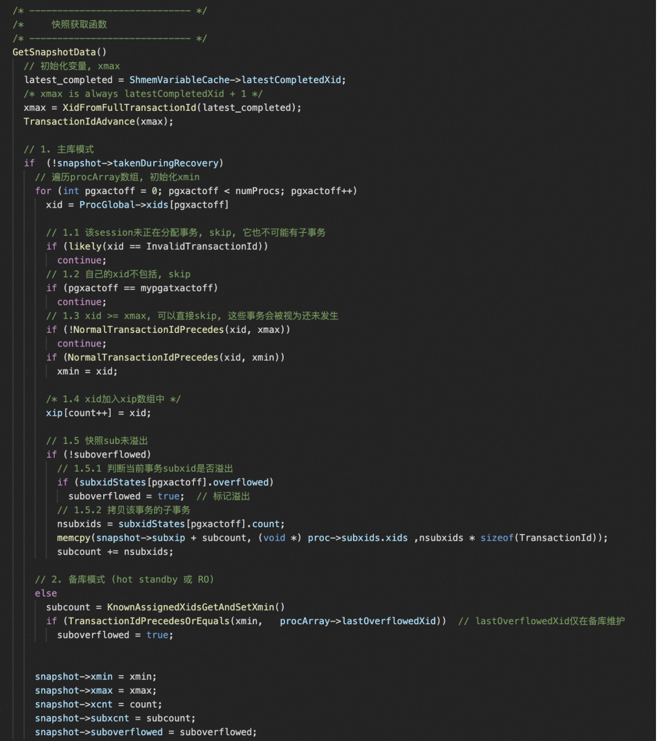 事务内执行第一个sql时,会调用快照获取函数GetSnapshotData()获取快照信息,并将快照信息复写到ActiveSnapshot->as_snap变量中。