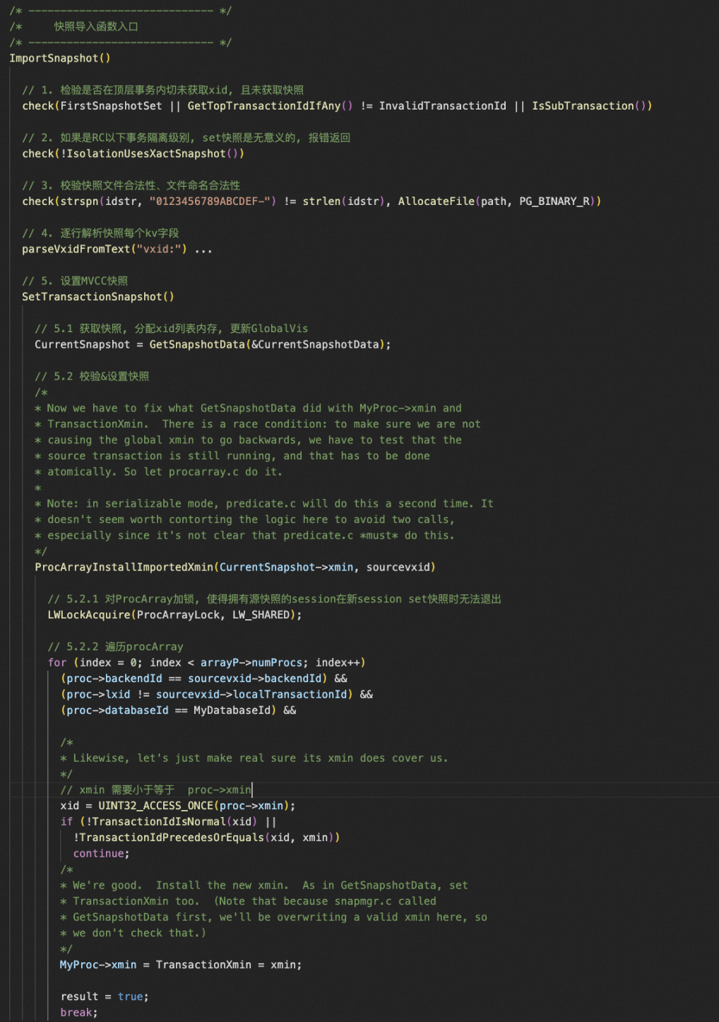 通过ImportSnapshot()函数将pg_snapshot目录下的指定快照进行校验,校验成功后将快照导入。