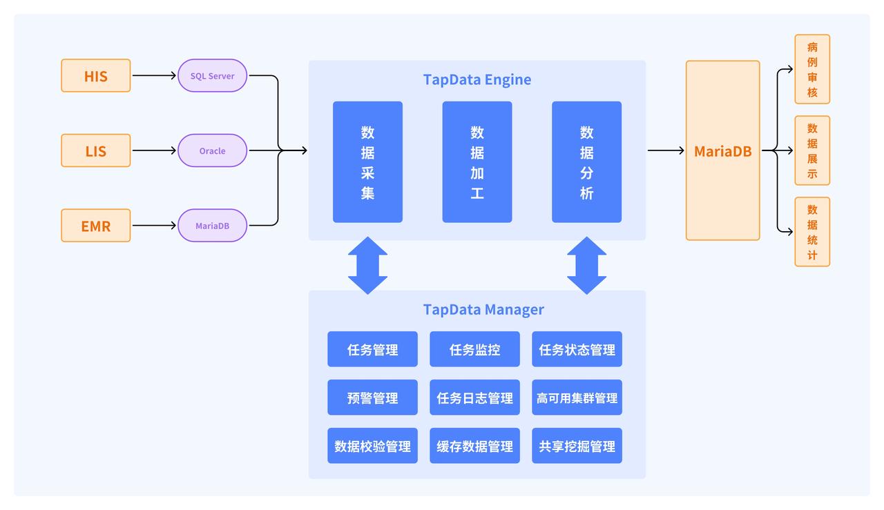 通过 TapData 集成高性能的数据存储和分析引擎,可支持大规模数据的存储和快速查询。通过与云端或本地的数据仓库集成,TapData 可以提供高效的存储解决方案,并支持复杂的分析任务,如数据挖掘、统计分析和机器学习模型的训练。这些功能有助于医疗机构从海量数据中提取有价值的洞见,支持临床研究、资源优化和个性化医疗服务的提供。