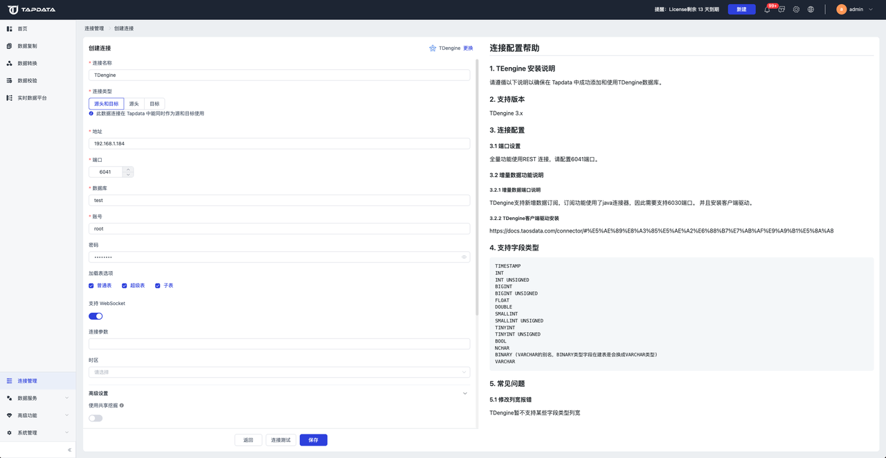 更多详情,参见《TapData 帮助文档-连接数据源-自建数据库 TDengine》:https://docs.tapdata.net/prerequisites/on-prem-databases/tdengine