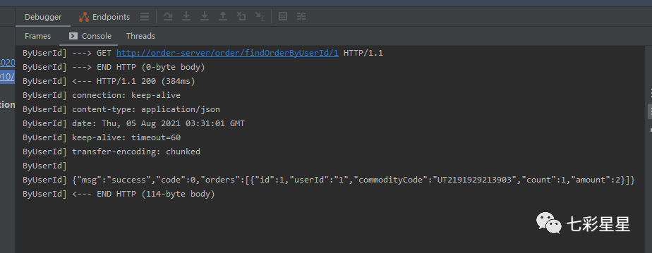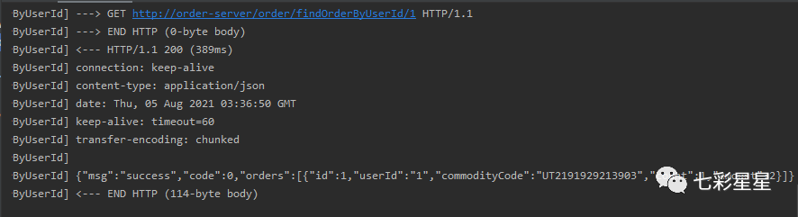 2021-08-05 11:22:08.205 DEBUG 14128 --- [nio-8010-exec-1] com.jiuge.user.feign.OrderFeignService : [OrderFeignService#findOrderByUserId] ---> GET http://order-server/order/findOrderByUserId/1 HTTP/1.12021-08-05 11:22:08.205 DEBUG 14128 --- [nio-8010-exec-1] com.jiuge.user.feign.OrderFeignService : [OrderFeignService#findOrderByUserId] ---> END HTTP (0-byte body)2021-08-05 11:22:08.562 DEBUG 14128 --- [nio-8010-exec-1] com.jiuge.user.feign.OrderFeignService : [OrderFeignService#findOrderByUserId] <--- HTTP/1.1 200 (356ms)2021-08-05 11:22:08.562 DEBUG 14128 --- [nio-8010-exec-1] com.jiuge.user.feign.OrderFeignService : [OrderFeignService#findOrderByUserId] connection: keep-alive2021-08-05 11:22:08.563 DEBUG 14128 --- [nio-8010-exec-1] com.jiuge.user.feign.OrderFeignService : [OrderFeignService#findOrderByUserId] content-type: application/json2021-08-05 11:22:08.563 DEBUG 14128 --- [nio-8010-exec-1] com.jiuge.user.feign.OrderFeignService : [OrderFeignService#findOrderByUserId] date: Thu, 05 Aug 2021 03:22:08 GMT2021-08-05 11:22:08.563 DEBUG 14128 --- [nio-8010-exec-1] com.jiuge.user.feign.OrderFeignService : [OrderFeignService#findOrderByUserId] keep-alive: timeout=602021-08-05 11:22:08.563 DEBUG 14128 --- [nio-8010-exec-1] com.jiuge.user.feign.OrderFeignService : [OrderFeignService#findOrderByUserId] transfer-encoding: chunked2021-08-05 11:22:08.563 DEBUG 14128 --- [nio-8010-exec-1] com.jiuge.user.feign.OrderFeignService : [OrderFeignService#findOrderByUserId]2021-08-05 11:22:08.563 DEBUG 14128 --- [nio-8010-exec-1] com.jiuge.user.feign.OrderFeignService : [OrderFeignService#findOrderByUserId] {"msg":"success","code":0,"orders":[{"id":1,"userId":"1","commodityCode":"UT2191929213903","count":1,"amount":2}]}2021-08-05 11:22:08.563 DEBUG 14128 --- [nio-8010-exec-1] com.jiuge.user.feign.OrderFeignService : [OrderFeignService#findOrderByUserId] <--- END HTTP (114-byte body)