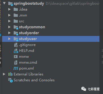 搭建个父工程 , springbootstudy ,建相应的moudle 工程 分别为 studyuser,studyorder