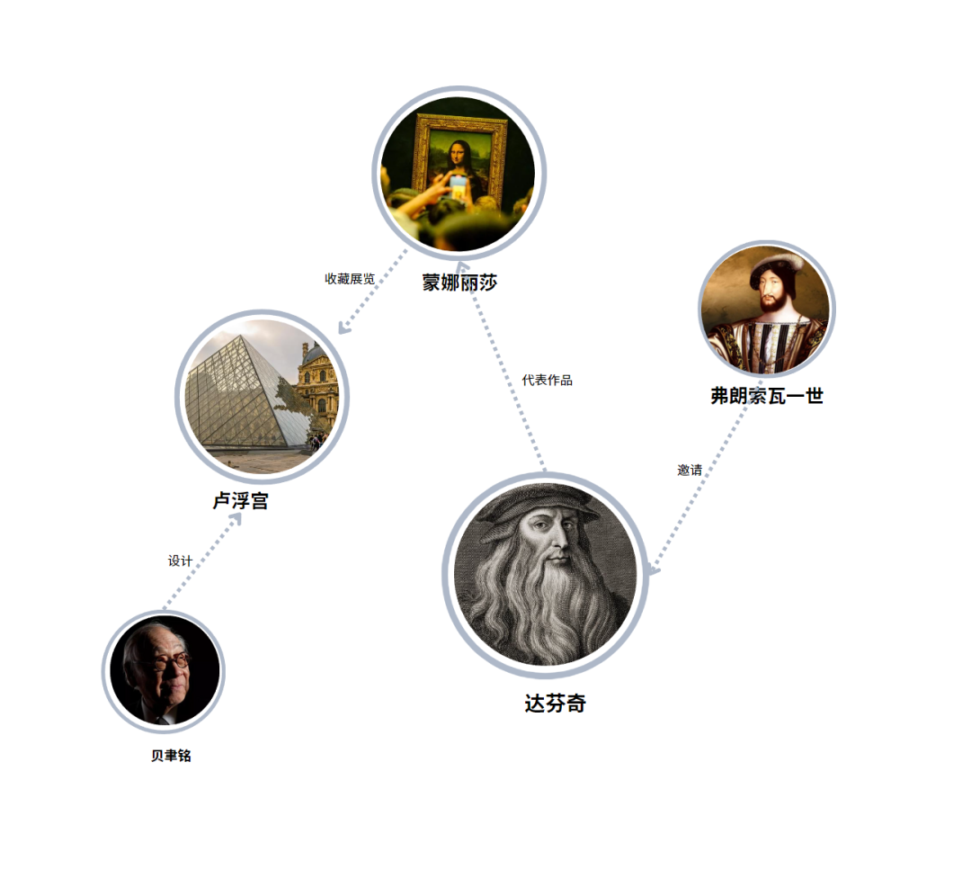 举例来说,当我们想知道达芬奇和卢浮宫之间有什么关系时,就可以通过点与点之间关联关系构成一张图了。