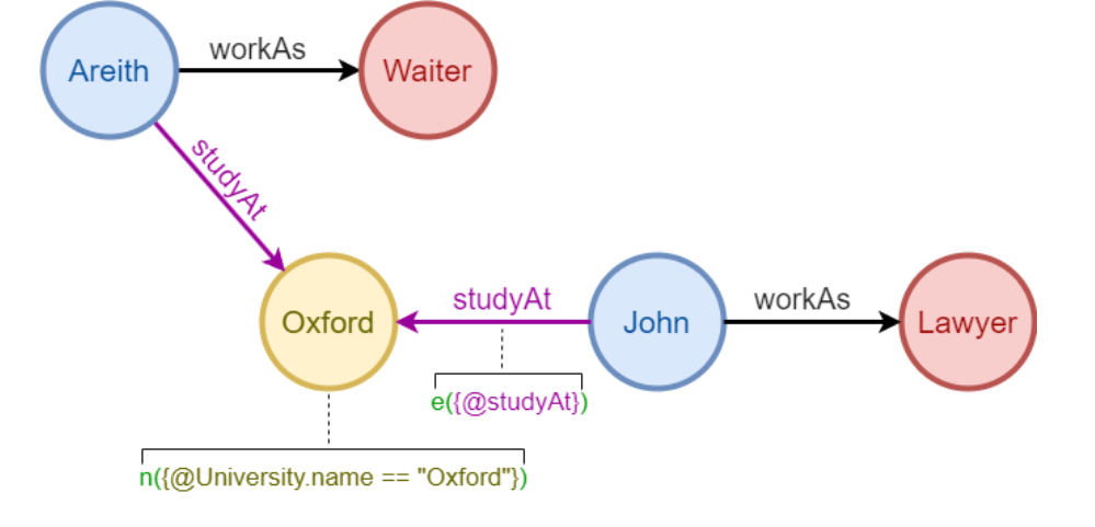 图5中由Areith、workAs、Waiter所形成的连续且点、边交替出现的序列是一条路径(Path)。同理,由Waiter、workAs、Areith、studyAt、Oxford构成的序列也是一条路径。