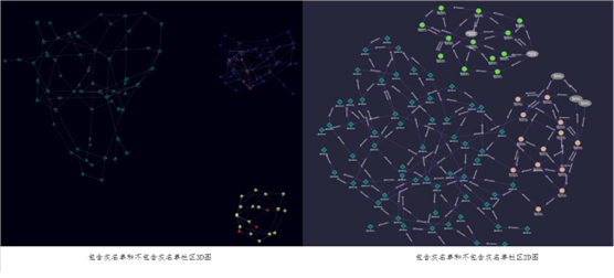 图数据库应该能够将查询或分析结果以2D(图9-右)或3D(图9-左)图的形式展现出来,其中节点可以用形状或图标表示,边则可以用线条或箭头表示。节点和边的不同颜色、大小、形状可以表示不同的信息,帮助用户更直观地理解和分析数据。这种可视化能力不仅提高了用户对数据的理解,也使得复杂关系和模式更容易被发现和分析。