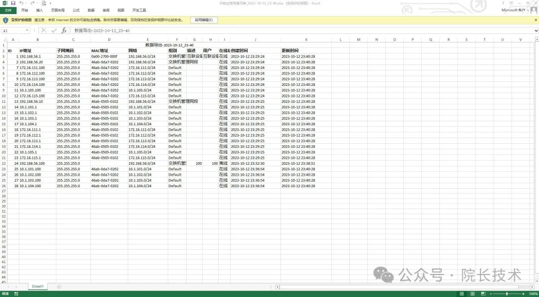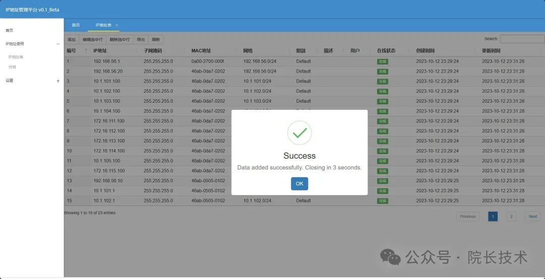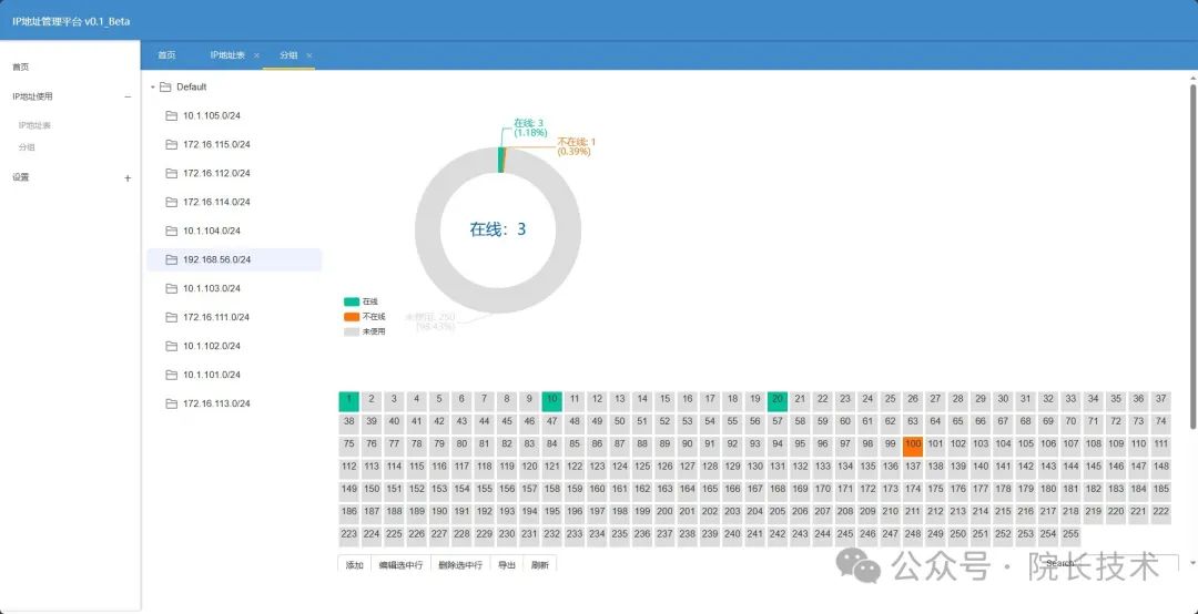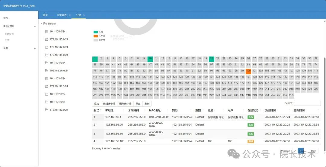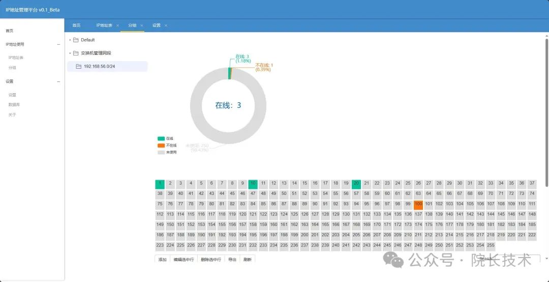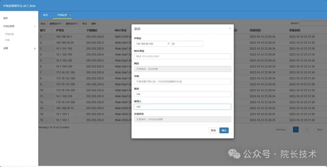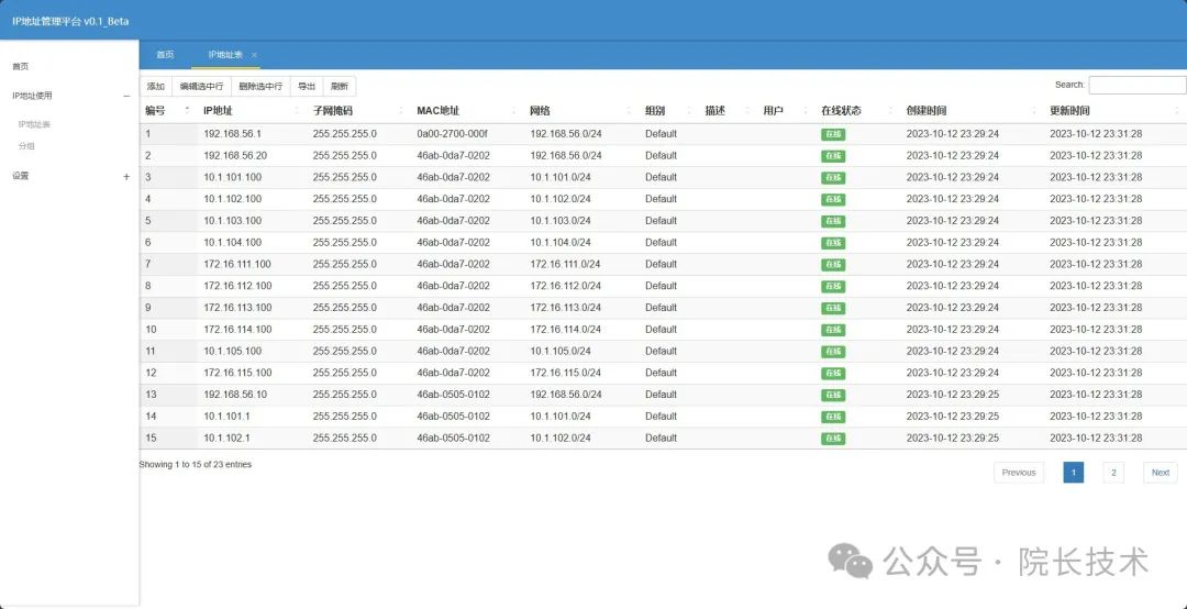 IP地址表:显示IP地址使用情况,可在页面进行增、删、改、导出到Excel表格
