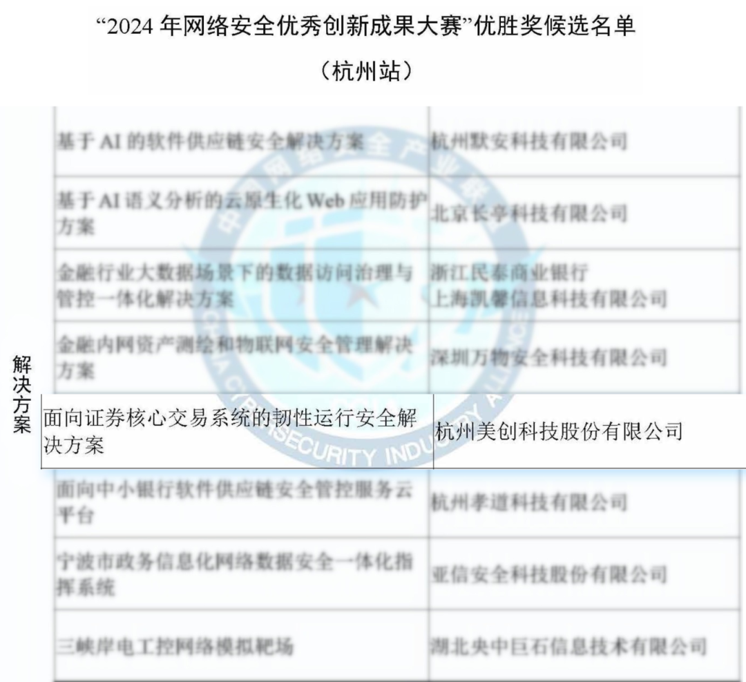 近日,“2024年网络安全优秀创新成果大赛-杭州分站赛” 正式公布评选结果。经全国9个省市50余家网络安全企业单位激烈角逐,美创科技参赛的“基于云知识库的全域数据安全自动化评估系统”、“面向证券核心交易系统的韧性运行安全解决方案”脱颖而出,双双斩获优胜奖!