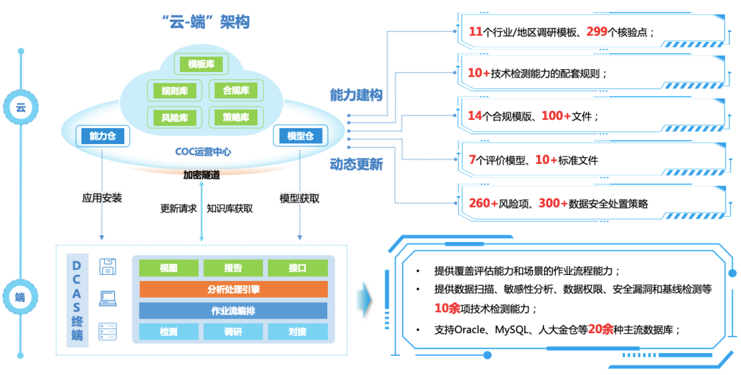 美创基于云知识库的全域数据安全自动化评估系统DCAS,基于行业丰富服务经验和技术转化云知识库,用自动化技术替代复杂人工评估,提供数据梳理、权限探测、现状识别、合规分析、能力分析、风险评估等多重检测和分析能力,满足各类用户开展数据安全评估和检查工作需要。