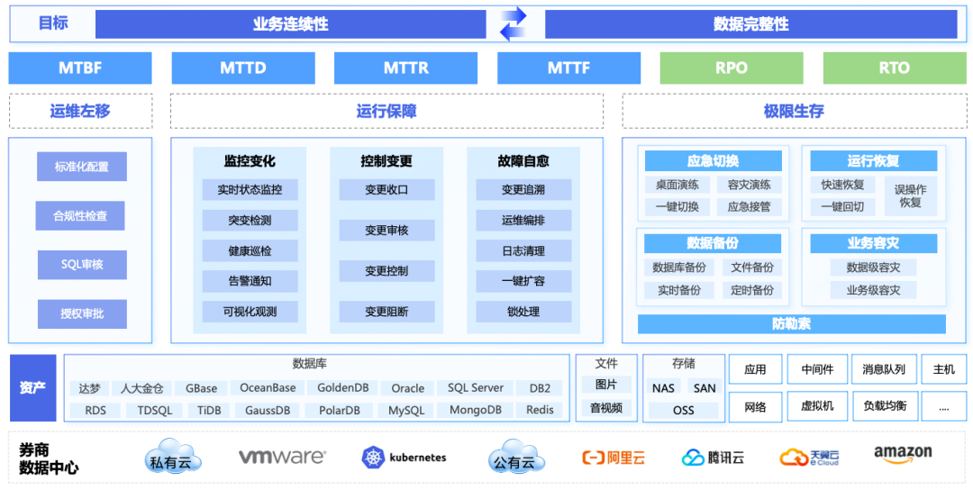 方案聚焦证券行业核心交易系统业务连续性和数据完整性,主要通过运维左移、实时监控、变更控制等功能确保证券核心业务稳定运行,并通过数据备份、数据容灾、业务容灾、容灾演练、一键切换等机制,解决核心交易系统数据可用和安全性、业务稳定性,满足行业监管合规等问题,提高核心交易系统抵御风险的能力。
