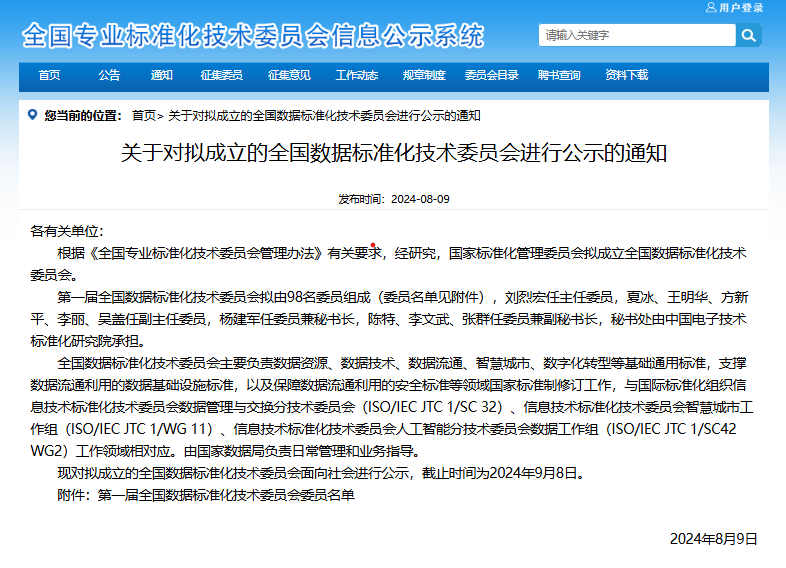 2024年8月9日,根据《全国专业标准化技术委员会管理办法》有关要求,经研究,国家标准化管理委员会拟成立全国数据标准化技术委员会。全国数据标准化技术委员会的筹建单位和业务指导单位为国家数据局,秘书处承担单位为中国电子技术标准化研究院。其成立对于推动我国数据领域的标准化工作,促进数据要素的价值释放,以及助力数字中国建设具有重要意义。