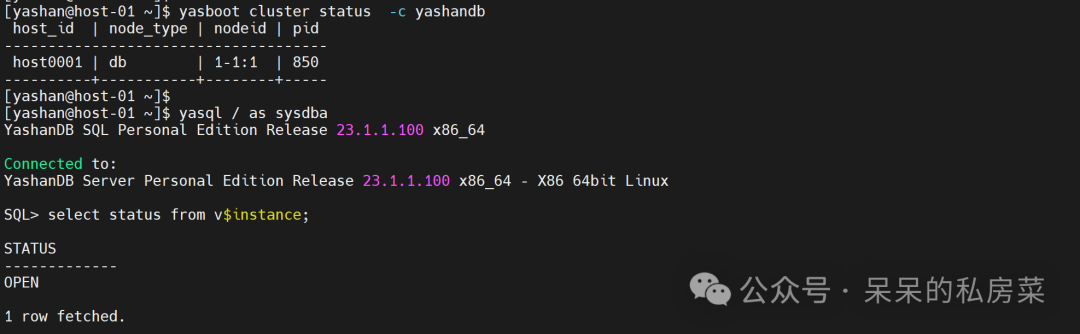 ## 1. 创建用户useradd -d home/yashan -m yashangroupadd YASDBAusermod -a -G YASDBA yashanecho "yashan" | passwd --stdin yashan## 2. 配置sudo免密cat >> etc/sudoers <<EOFyashan ALL=(ALL) NOPASSWD:ALLEOFchmod -w /etc/sudoers## 3. 创建目录mkdir -p data/yashan/{soft,data,yashan}chown -R yashan.YASDBA datachmod 755 /data## 4. 解压软件tar xzf /home/yashan/yashandb-personal-23.1.1.100-linux-x86_64.tar.gz -C /data/yashan/soft## 5. 数据库安装部署cd data/yashan/soft/yashan_soft="/data/yashan/soft"##生成数据库部署文件${yashan_soft}/bin/yasboot package se gen --cluster yashandb -u yashan -p yashan --ip 127.0.0.1 --port 22 --install-path /data/yashan/yashan/yasdb_home --data-path /data/yashan/data/yasdb_data --begin-port 1688##执行数据库安装,结束之后会启动yasagent和yasom两个${yashan_soft}/bin/yasboot package install -t hosts.toml -i /home/yashan/yashandb-personal-23.1.1.100-linux-x86_64.tar.gz##数据库部署${yashan_soft}/bin/yasboot cluster deploy -t yashandb.toml## 6. 环境变量配置cat data/yashan/yashan/yasdb_home/yashandb/23.1.1.100/conf/yashandb.bashrc >> home/yashan/.bash_profilesource ~/.bash_profile## 7. 修改sys用户口令${yashan_soft}/bin/yasboot cluster password set -n yashan#2023 -c yashandb##8. 查看数据库状态${yashan_soft}/bin/yasboot cluster status -c yashandb -d## 9. 崖山登录测试${yashan_soft}/bin/yasql sys/yashan#2023@127.0.0.1:1688 -c "select 'Hello, yashan' from dual;"## 看到命令结束,回显输出OPEN状态,即表示数据库安装完成。