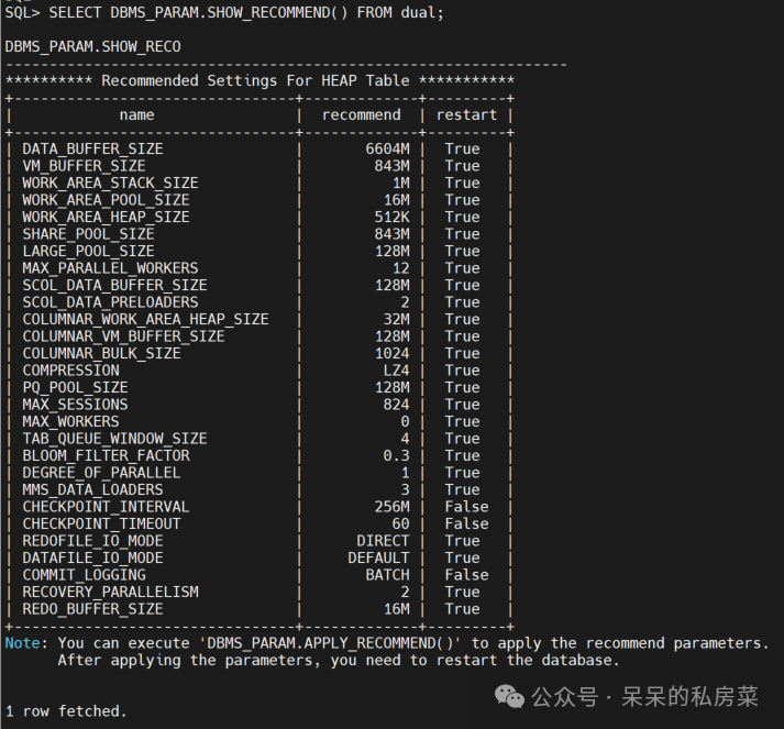 # 这个存储过程用于生成推荐参数DBMS_PARAM.OPTIMIZE (apply_parameter BOOL,table_type VARCHAR,os_memory_limit NUMBER,os_cpu_limit NUMBER,data_path VARCHAR,redo_path VARCHAR);# 1. 使用默认的HEAP表类型,分配100%的内存,100%的CPU,生成推荐参数后,不写入配置文件。EXEC DBMS_PARAM.OPTIMIZE(NULL, NULL, 80, 80);# 2. 查看最近一次推荐参数的报告SELECT DBMS_PARAM.SHOW_RECOMMEND() FROM dual;# 3. 应用参数EXEC DBMS_PARAM.APPLY_RECOMMEND();