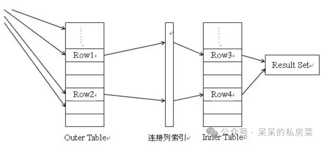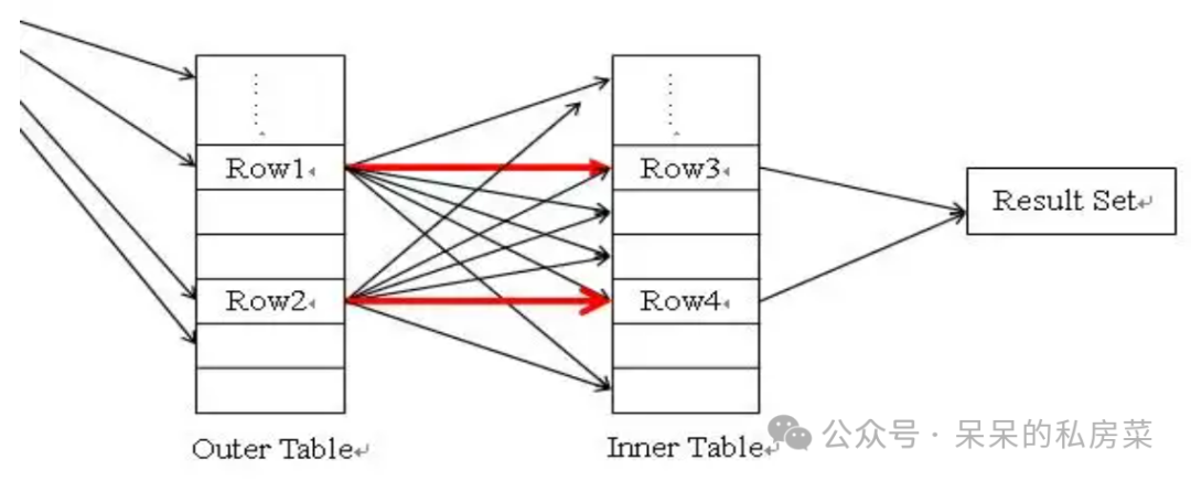 1. 首先检索驱动表外侧表(全表扫描),获取到符合外侧表单独条件的记录行集合(row1和row2);2. 针对row1和row2,分别对inner表进行全表扫描匹配,就是对每个outer的结果行,要进行inner表的所有块查询,最终发现符合条件的row3和row4,将结果返回。我们可以发现Nest Loop Join存在大量的随机读。一个外表行,就需要进行内表的全表扫描;如果内表很大,那么执行计划效率就会很差。