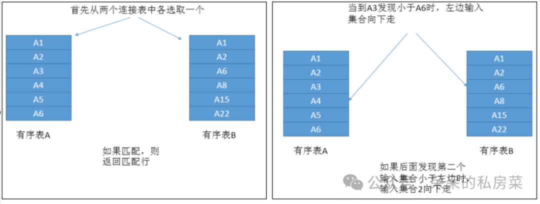 1. Merge join首先从两个输入集合中各选取第一行,如果匹配,则返回匹配行;2. 假如有行不匹配,则有较小值的输入集合 +1,继续往匹配。